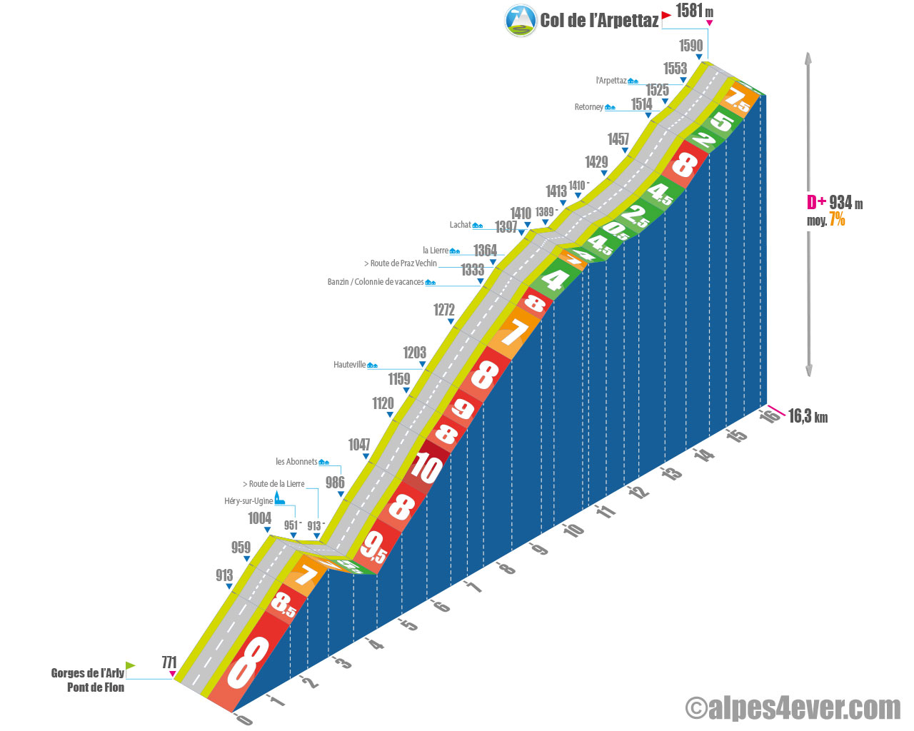 - Cette partie est longue de 6,5 km. Peu avant les chalets de la Lierre, la pente va faire relâche avec 900 m à 4%. Une petite butte de 200 m à 7% pourra vous surprendre avant d’atteindre Lachat. Sur les 3 kilomètres suivants, vous enchaînerez sur une succession de légères descentes (2) et montées (entre 2,5 et 4,5%). Profitez-en pour admirer le Mont Blanc ! À la suite de ce replat, il faudra tout de même négocier une bonne rampe de 700 m à 8%. Un nouveau replat de 500 m à 2,5% qui ressemble fortement à un col se présente à proximité de la ferme de Retorney. Vous bénéficierez d’une vue magnifique sur le Mont Charvin. Il faudra fournir un ultime effort de 500 m à 5% suivi de 500 m à 7,5% pour atteindre un point culminant situé à 1590 m d’altitude situé à proximité de la ferme de l’Arpettaz. Puis enfin, vous atteindrez dans une courte descente le Col de l’Arpettaz à 1581 m d’altitude.