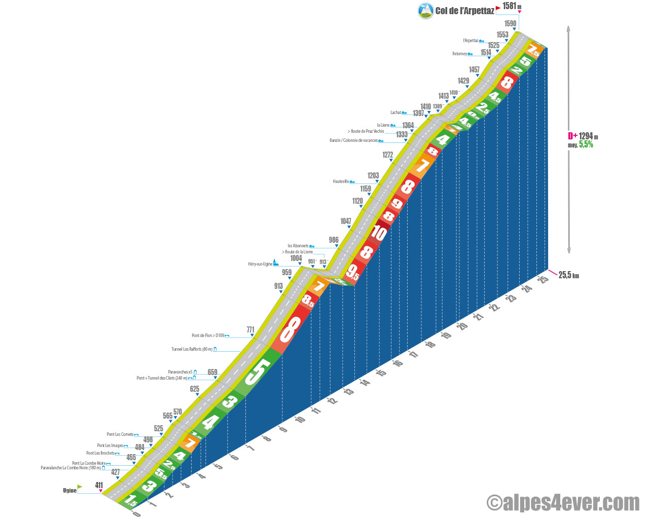 Cette ascension – qui est une variante de celle présentée ci-dessus – débute à partir de la D1508 à proximité d’Ugine. Via les Rippes, c’est une bonne montée de 2,6 km sur des pentes oscillants souvent à près de 8% qui vous guidera jusqu’à Mont Dessous. Puis une légère descente de 500 m vous mènera à la Route du Col de l’Arpettaz. Vous reprendrez ainsi la partie de 12,9 km décrite de la variante présentée ci-dessus. Attention, même si elle est un peu plus courte – 15 km – et avec un peu moins de dénivelé… son pourcentage présente un joli 8%, la rendant plus dure !