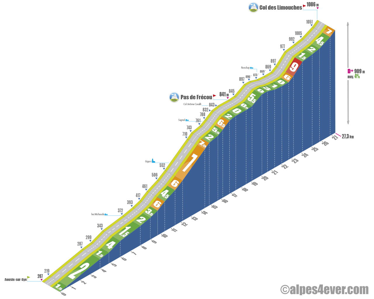 Arrivé sur le replat qui mène à Cavalli, on tourne à gauche pour allez aux Limouches. Et là deux méchants raidars, un de 14% et un autre de 12%. Faits hier sous le cagnard. On est loin des ‘gentils’ 9% du graphe, même si celui est exact et représente la moyenne de ce méchant passage.