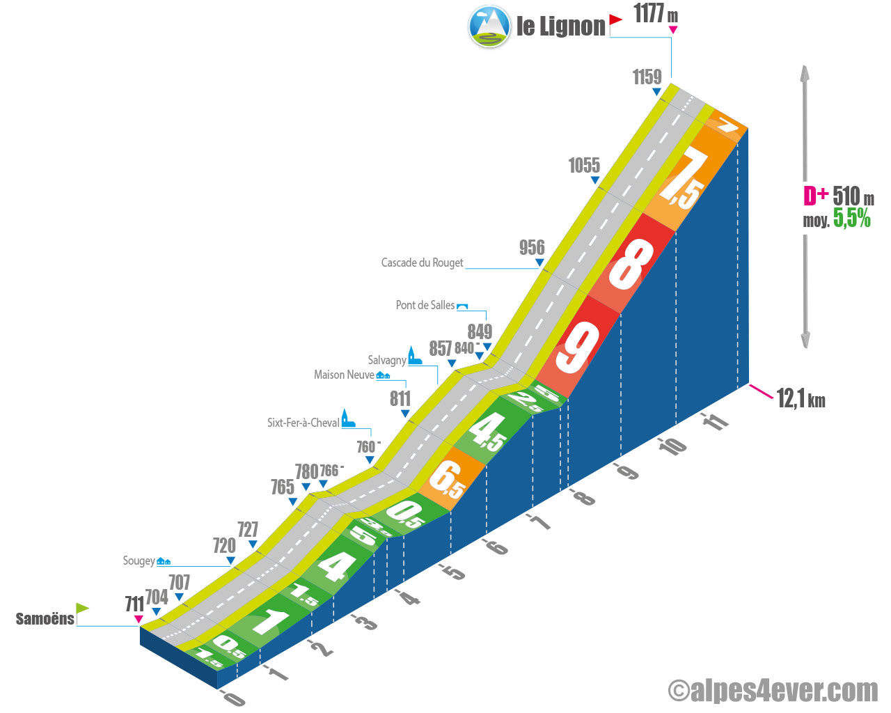 C’est du 8/9% de moyenne jusqu’au sommet, avec quelques virages où ça se calme un peu. Le point d’orgue de la montée est l’imposante Cascade du Rouget. Car avant de la voir, on l’entend… Attention car d’expérience, l’eau de la cascade peut vous mouiller légèrement même sur la route ! Une fois au Lignon, fin de la route en goudron : terminus ! En été, une brasserie permet de se poser. C’est aussi le point de départ (et le parking) pour des randonnées vers les Chalets de Sales ou le Collet d’Anterne situé le célèbre GR5 qui permet de traverser les Alpes françaises à pied.