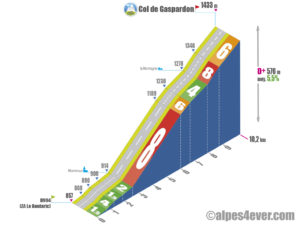 Les affaires reprendront lorsque la route – qui va devenir assez étroite – amorcera une belle courbe sur la droite : 800 m à 8% et 1,5 km à 6% qui vous permettront de finir convenablement au Col de Gaspardon à 1433 m d’altitude au milieu de nulle part. La route continue encore sur un petit kilomètre pour descendre jusqu’à un parking pour randonneurs.