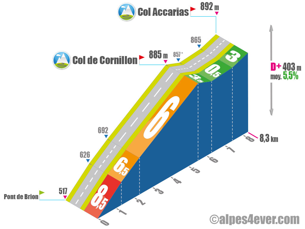 Je vous propose 4 variantes dont 3 ont la particularité d’avoir un pont comme point de départ. Les ascensions ne sont pas très longues – entre 3,6 et 9,6 km – et les difficultés assez variables car elles sont assez irrégulières avec quelques descentes qu’il faudra remonter. La plus difficile est celle qui part du Pont de Cognet avec les 3500 premiers mètres entre 8 et 8,5%. Le versant partant du Pont de Brion vous fera passer par un col intermédiaire : celui de Cornillon (882 m). D’ailleurs, ce dernier étant assez proche du Col Accarias, vous pouvez varier vos ascensions avec les variantes proposées sur cette page.
