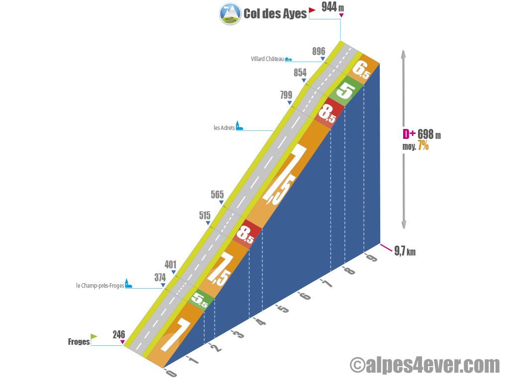 Depuis la Vallée de l’Isère, tous les chemins semblent mener au Col des Ayes… pas moins de 8 variantes pour l’atteindre à 944 m d’altitude. Cette dernière donnée vous apparaît modeste mais chaque variante vous proposera, sur une distance comprise entre 10 et 12 km, une montée assez rude avec souvent des passages à plus de 8%.