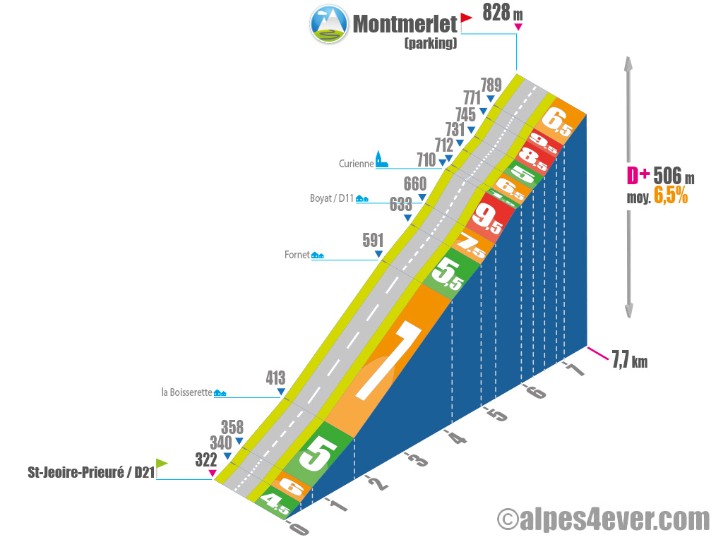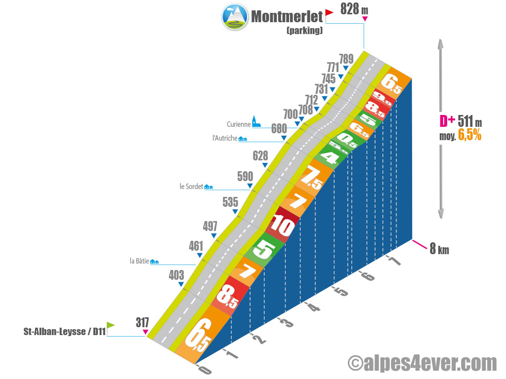 Montmerlet est un tout petit hameau perché sur le Mont Saint-Michel qui domine Challes-les-Eaux. Il est possible d’atteindre un point culminant situé à un parking à 828 m d’altitude, l’accès final au hameau étant réservé aux habitants. 2 versants bien ardus sont possibles au départ de Saint-Alban-Leysse ou de Saint-Jeoire-Prieuré. Ils se rejoignent à Curienne où débute un court final (1650 m) en réaliser aller-retour.
