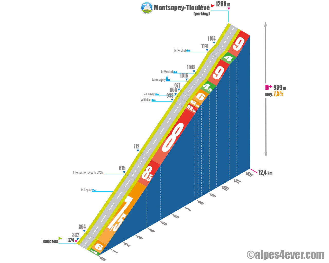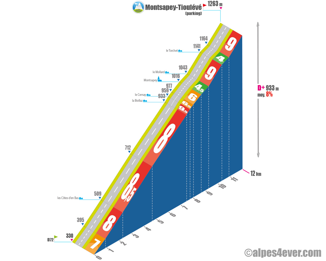 Montsapey-Tioulévé est une ascension située en Savoie au début de la Vallée de la Maurienne. Elle permet de grimper – en aller-retour – via Montsapey, un village de montagne perché à 1000 m d’altitude, jusqu’au parking de Tioulévé situé lui à 1263 m d’altitude.