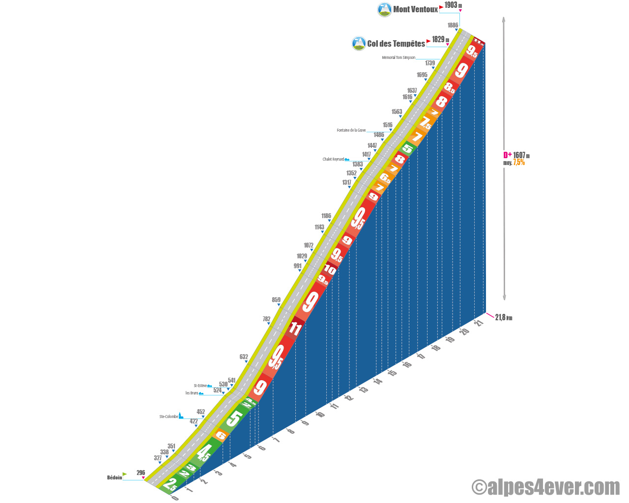 On peut découper ce final en 3 parties : une première longue de 1,5 km entre le Chalet Reynard et la Fontaine de la Grave où la déclivité va être un peu irrégulière un bon 7/8% sur 900 m puis un replat à 5% sur 600 m (ce dernier vous donnera l’impression de bien avancer… rester calme et profitez-en absolument car ce sera le tout dernier !), une seconde longue de 1,7 km où la déclivité oscillera entre 7 et 7,5% puis une troisième de 3 km où la déclivité passera implacablement de 8 à 9,5%… c’est ici que vous connaîtrez l’instant de vérité : allez-vous abandonner ou engager l’un des plus gros combats de votre vie cycliste ! Les passages aux abords du Mémorial Tom Simpson puis du Col des Tempêtes (oui, vous franchirez à cette occasion un col situé à 1829 m d’altitude référencé par le Club des Cent Cols mais attention, comme son nom l’indique, c’est ici que les rafales de vent sont les plus fortes et peuvent même vous déséquilibrer !) marqueront votre effort dans ce final dantesque. Et puis, pour couronner le tout, il y a après le dernier virage, une terrible rampe de 150 m à 11,5% où il faudra trouver la force mentale pour se hisser au sommet du Mont Ventoux à 1903 m d’altitude.
