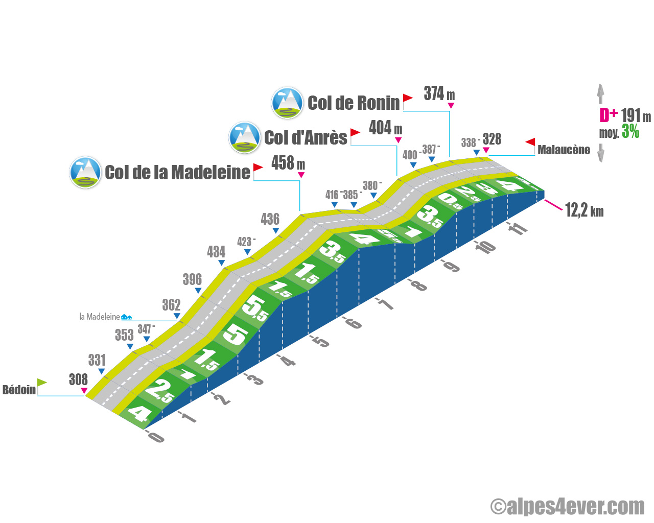 Vous serez parfois amené à rejoindre le pied des ascensions de Bédoin ou Malaucène en effectuant la liaison entre ces 2 derniers (ou à rejoindre le point de départ après avoir fait une boucle montée + descente par l’autre versant). Longue de 12,2 km, elle n’est pas très difficile (max 5,5%) mais il faudra tout de même ajouter 191 m de D+ pour le sens Bédoin > Malaucène ou 171 m de D+ pour le sens Malaucène > Bédoin à l’ascension initiale. Vous franchirez aussi à cette occasion 3 cols référencés par le Club des Cent Cols : le Col de la Madeleine – 458 m (non, ce n’est pas celui qui se trouve en Maurienne !), le Col d’Anrès – 404 m et le Col de Ronin – 374 m dans le sens Bédoin > Malaucène (Ronin, Anrès et Madeleine dans le sens Malaucène > Bédoin).